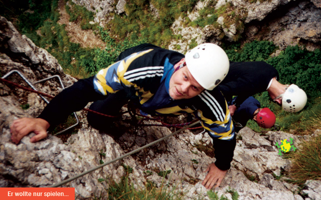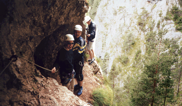 So ging es mehrere Stunden durch die Berge, vielfach mit kurzen Hosen und rutschigen Sneakern bekleidet. Ein Kollege musste sogar von mehreren Bergführern aus einer Felswand befreit werden: Erschöpfung und Lederschuhe mit glatter Sohle forderten ihren Tribut. Den Rest erwartete gegen späten Mittag nicht ein leckeres Essen, sondern eine Seilbahnfahrt weiter die Berge hinauf. Auf einer im Winter als Skihang genutzten Wiese folgte eine halsbrecherische Abfahrt auf Rollern, die mit großen Gummireifen ausgestattet waren. Zu dumm, dass das hohe Gras die quer zum Hang laufenden Traktorreifen-Rinnen verdeckte: Ich hatte Glück, aber einige neben mir fahrende Kollegen stiegen Kopf voran über den Lenker ab; sprich: sie wurden kanonenkugelartig talwärts katapultiert. Glücklicherweise blieben den Pechvögeln keine gebrochenen Gliedmaßen, sondern nur Schürfwunden und zerrissene Klamotten als Andenken.
