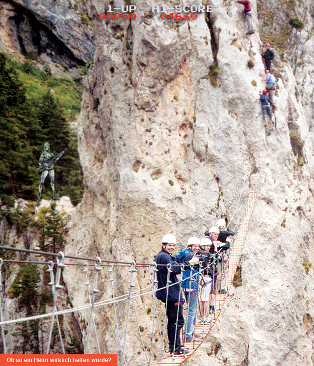 Auf etwa halber Strecke marschierte eine französische Betreuerin mit Klemmbrett und Teilnehmerliste durch den Bus und fragte in gebrochenem Englisch: “Paragliding or Ill Climbing?” Da die Option “Grillfleisch und bayerisches Bier” auch auf Nachfrage nicht angeboten wurde, entschied ich mich fürs “Ill Climbing” als Oberpfälzer kennt man sich mit Mittelgebirgen und Hügeln aus. Kurz vor der Ankunft gab die Französin schließlich bekannt, dass das “Paragliding” aufgrund des schlechten Wetters (zu viel Wind) entfallen würde und stattdessen nun alle zum “Ill Climbing” eingeteilt sind. Die Späße über die vermeintlich dilettantische Aussprache des Hügelbesteigens blieben uns im Hals stecken, als uns Bergführer in 5er- bis 7er-Seilschaften einteilten, die Handhabung der beiden Sicherungsseile erklärten (eins bleibt immer am Führungsseil!) und Schutzhelme verteilten das “kranke Kraxeln” der Französin traf den Nagel doch ganz gut auf den Kopf.