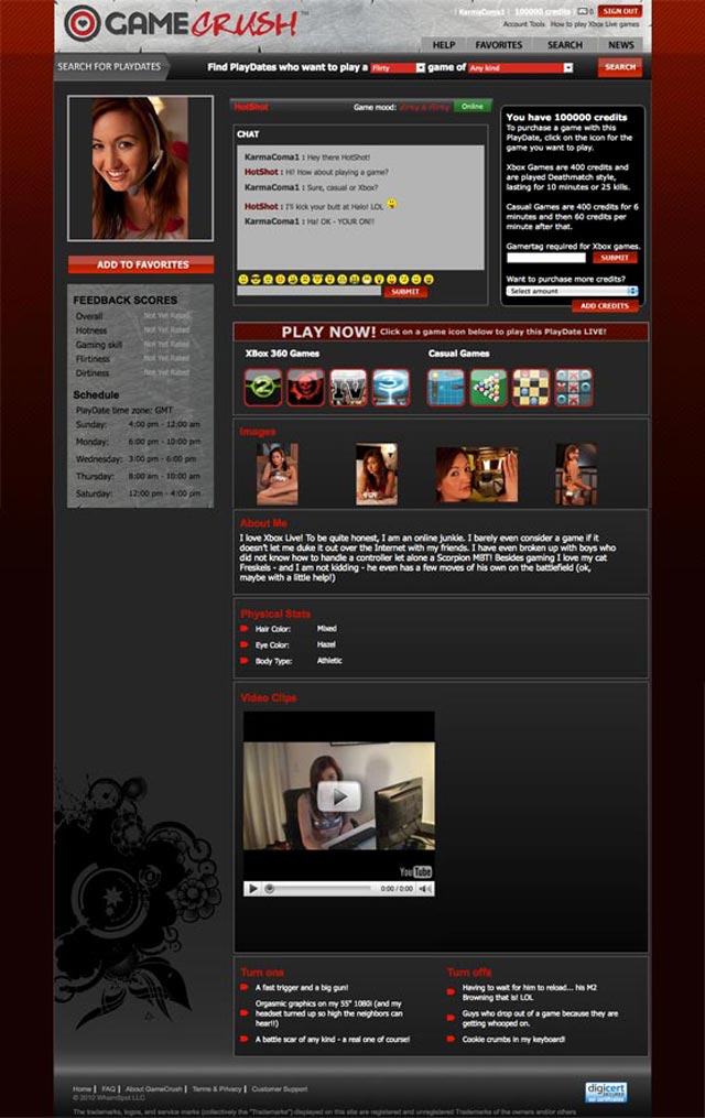 Eine ähnliche Richtung schlägt das neu eröffnete Portal GameCrush ein, verknüpft das Konzept aber mit einer pfiffigen Idee: Statt willfährige Mitmenschen zu verkuppeln, hat sich das Unternehmen zum Ziel gesetzt, Zockern ein unwiderstehliches, weil scheinbar besonders tolles Angebot zu unterbreiten. Wer gerne online spielt und dabei in den genuss weiblicher Gesellschaft kommen möchte, leistet sich ein “PlayDate” – Ähnlichkeiten zu Hugh Heffners barbusigen Playmates sind selbstverständlich rein zufällig – um gemeinsam online zu daddeln, zu chatten und um das Mädel aus der Ferne anzuhimmeln. Schließlich tut das seine Flirt-Bereitschaft schon im Status kund: “Flirty or dirty” lautet seit 23. März die Devise auf www.GameCrush.com.