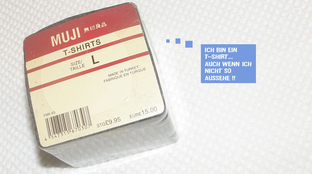 Doch nun zu meinem Einkauf. Ein T-Shirt. Warum ich mir ein schnödes, graues (und obendrein noch recht klein ausfallendes) Shirt gekauft habe? Weil es so schick verpackt war. Wann habe ich schon mal ein T-Shirt gekauft, das zu einen 5 x 5 x cm kleinen Würfel gepresst wurde. Richtig – noch nie! Auch das Auspacken hat Spaß gemacht.