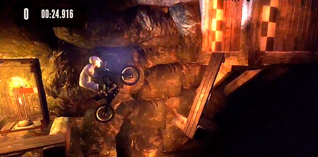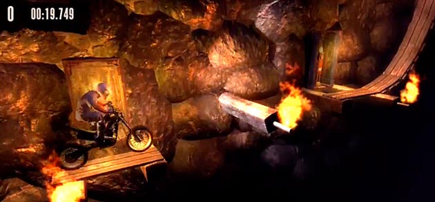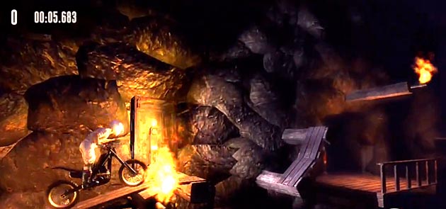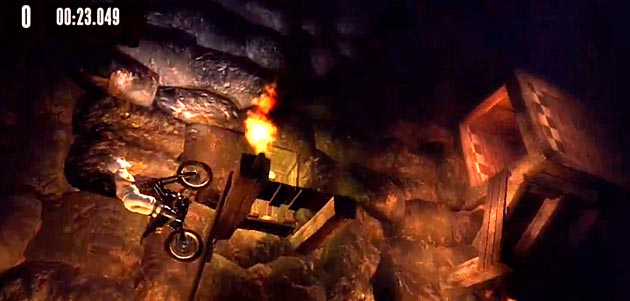 Wer Trials HD kennt, der weiß, dass man für jede Strecke ‘nur’ 30 Minuten und 500 Versuche brauchen darf. Danach fliegt man raus, die Checkpoints sind dahin und der Spaß beginnt von vorn. Die Versuche sind in diesem Fall nicht mein Problem – die kriege ich in der Restzeit nie und nimmer voll. Doch die nur noch fünf Minuten machen mir Angst. Dieses Hindernis wartet auf mich: