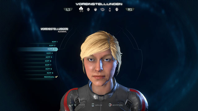 Meinen ersten großen Kampf in Mass Effect: Andromeda fechte ich mit dem Charaktereditor aus. Ich bin ziemlich pingelig, was das Aussehen meines Charakters betrifft, den Standardlook werde ich schon aus Prinzip nicht wählen. Also muss ich mich für eines der vorgegebenen Gesichter entscheiden und dieses modifizieren. In der Vorauswahl tummeln sich ziemlich viele Gesichtsbaracken -– Dumpfbacke konkurriert mit Hackfresse. Man kann zwar aus allen anfänglichen Ungestalten ganz passable Gesichter basteln, doch die Variationsmöglichkeiten sind begrenzt. Das Resultat ähnlich stets sehr dem “Basismodell“, so stark habe ich das aus früheren Mass Effect-Teilen nicht in Erinnerung. Ich bin etwas frustriert ob der Tatsache, dass ich keine Hakennase machen kann und auch nicht die geschürzten Lippen mit den geschwungenen Augenbrauen kombinieren. Da bin ich eigen, ich steh’ nun mal auf einen bestimmten Frauentyp. Aber Hauptsache, man kann knallpinken Lidschatten auflegen und sein halbes Gesicht tätowieren – ich will doch nicht aussehen wie ein Clown. Nach einer knappen Stunde resigniere ich und wähle Kopf eins – die “Japanerin” – als kleinstes der Übel. Raus kommt eine Mischung aus Jennifer Lawrence und Scarlett Johansson. Das klingt nun etwas klischeehaft, aber lieber nehme ich Everybody´s Darling, als mich ewig über den ungesunden Teint oder das fliehende Kinn eines anderen Gesichtsyps ärgern…