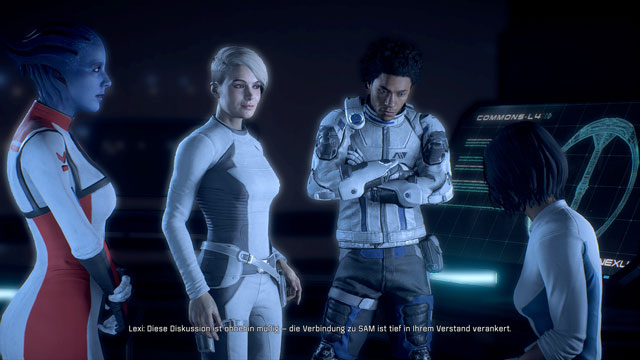 Außerdem hätte es sonst nie zu folgender Szene kommen können: Nach dem Sturz ist mein Helm schwer beschädigt, unkontrolliertes Nach-Luft-Schnappen unterstreicht: Es ist wirklich ernst. Der Pathfinder ist wohlauf, in einem Akt väterlicher Aufopferung nimmt er seinen Helm ab und setzt ihn mir auf. Alles wird schwarz und ich erwache auf der Krankenstation des Mutterschiffes. Als die KI SAM in meinem Kopf ertönt und niemand anderes es hört, wird mir bewusst: Mein Vater hat mir nicht nur das Leben geschenkt, die KI war in seinem Kopf mit ihm verbunden und ist es nun mit mir