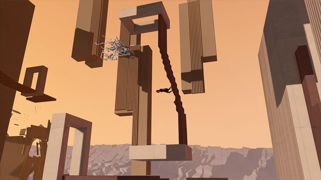 Und erst die Animationen meiner Spielfigur: Elegant drückt sie sich an Wände, läuft auf den Zehenspitzen, vollführt Pirouetten und Überschläge. Lege ich den Controller ein paar Sekunden beiseite, macht die Ballerina ein paar Stretch-Übungen. Begleitet von mal luftigen, mal bedrohlichen elektronischen Klängen springe und hopse ich weiter wenn zuckende Tentakel (oder sind es Flammen oder Nadeln?) nach mir greifen, genügt ein Druck auf die Viereck-Taste, um mich zu befreien. Am Ende jedes Spielabschnitts tanze ich gegen wabernde Polygon-Gebilde an, ergründe in düsteren Räumen die Kindheit meiner Spielfigur und surfe auf einem Stoffband nochmal an den surrealen Level-Kompositionen vorbei. Wow.