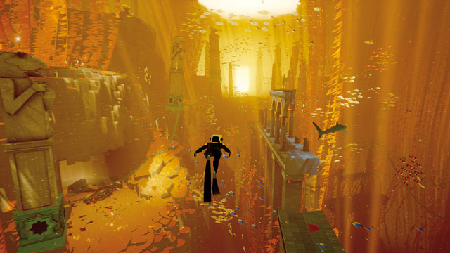 Und vor allem: ABZÛ ist wie ein Rausch der Name von Luc Bessons Filmklassiker “Im Rausch der Tiefe” wäre ein allzu passender Untertitel für das Spiel gewesen. Die stilisierte 3D-Optik entführt Euch auf einen atemberaubenden Unterwasser-Ritt: Ihr schwimmt mit Mantarochen, Blauwalen und Koboldhaien. Ihr lasst Euch von der Strömung mitreißen und taucht durch Fischschulen, die auseinanderfliehen wie Feuerwerk. In traumhaften Szenen lasst Ihr Wasserfälle unter Wasser entstehen oder taucht durch einen gigantischen Fischschwarm, der wie ein Tornado aus zuckenden, blitzenden Leibern wirkt. Begleitet wird all das von einem bestechenden Klassik-Soundtrack von Journey-Komponist Austin Wintory, der ganz hervorragend zum Spiel und seinen Settings passt.