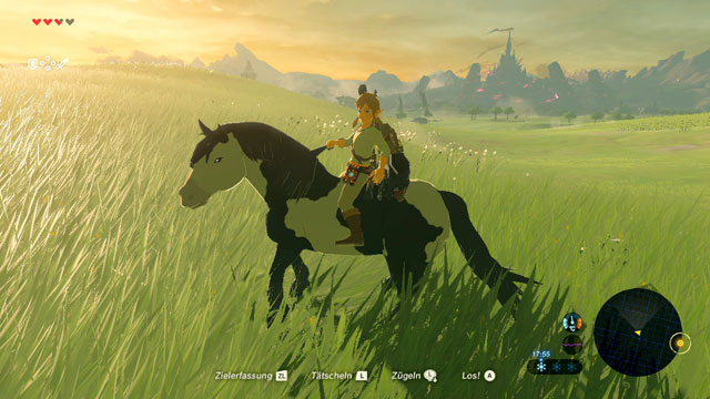 Das Sprinten über die weitläufigen Grasebenen, an Flüssen entlang oder durch Wälder ist angesichts Links kurzer Ausdauerleiste etwas ermüdend wie praktisch, dass ich eine kleine Gruppe grasender Wildpferde entdecke. Geduckt schleiche ich durch hohe Gras heran, sprinte im richtigen Moment los und bekomme einen Tritt ins Gesicht, der Link in hohem Bogen auf den Boden befödert. Es war wohl nicht so schlau, von der Po-Seite des Pferdes aufsitzen zu wollen. Beim zweiten Versuch aber klappt alles besser, das Ross bäumt sich kurz auf, ich bleibe jedoch im Sattel und trabe bald schon elegant über die Pampa. Mein toll animierter Gaul freut sich über Streicheleinheiten, kann jedoch noch nicht sehr lange galoppieren. Wenn ich beim flotten Ritt etwas interessantes entdecke, hopst Link mit einem Knopfdruck herunter, natürlich kann ich aber auch zu Pferde Schwertstreiche verteilen oder Pfeile verschießen. Nach einer Weile komm ich zur ersten menschlichen Behausung in Breath of the Wild. Ich bin tatsächlich etwas aufgeregt, wer da mitten im Nirgendwo sein Domizil gebaut hat.
