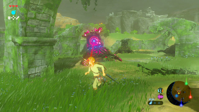 Überall in Hyrule treffe ich auf Überreste von Wächter-Maschinen – das sind diese Kampfroboter, die auf ihren Tentakeln herumhuschen und schon lange in den Breath of the Wild-Trailern gezeigt wurden. Die meisten davon sind kaputt – überwuchert oder halb zerlegt zieren sie die Landschaft und spendieren ein paar Maschinenteile. Einige jedoch haben überlebt und sind brandgefährlich: Sie sind schnell, nehmen Link mit ihrem Laser ins Visier und verteilen tödliche Feuerstöße. Vor allem für die ersten Spielstunden rate ich: Bleibt ihnen fern! Und wenn Euch einer entdeckt hat: Rennt nicht blind fort, sondern sucht Deckung – unterbrecht die direkte Sichtlinie zwischen ihrem Geschütz und Link. Und keine Sorge: Später sind sie immer noch harte Gegner, doch Ihr werdet Waffen erhalten, mit denen Ihr veritable Chancen gegen die Maschinenplage habt. Ach ja: Fliegende Versionen gibt es übrigens auch…