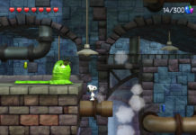 Als kleiner Blechkerl mit besagtem Kleidungsstück rennt und hüpft Ihr durch hübsch illustrierte Pixelwelten, immer auf der Suche nach dem Teleporter zum nächsten Abschnitt....