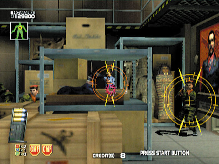Futter für die Knarre: Neben der indizierten Zombie-Zerstückelung rund um das Totenhaus ist die dynamische Agentenballerei die einzig weitere Option (und damit Pflichtkauf) für Besitzer der Dreamcast-Lichtpistole. Statt hektischem Dauerballern zählt hier ein sicheres Schützenauge, denn wie bei den indirekten Polizei-Vorgängern reicht bei Feinden meist schon ein Volltreffer.