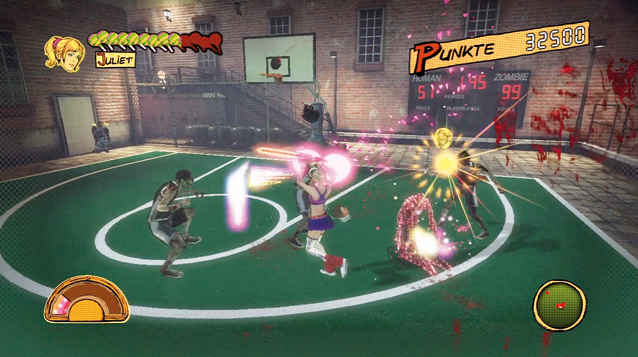Bevor wir ans Eingemachte gehen, hier die Eckdaten der klischeebeladenen Hintergrundgeschichte: Cheerleaderin Juliet (sexy, aber züchtig) muss an ihrem 18. Geburtstag feststellen, dass ihre Schulkameraden in Zombies verwandelt wurden. Wie gut, dass die Lolita von ihrer Familie zum Untotenjäger ausgebildet wurde. Mit Kettensäge, Pompons und wehendem Minirock schnetzelt sich der feuchte Traum pubertärer Jungs durch Horden muffiger Monster, kaut dabei lasziv auf Lutschern und kommt einem rachsüchtigen Verehrer auf die Spur. Immer an ihrer Seite: ihr schmalzlockiger Freund Nick (sportlich, aber feige), den Juliet wegen eines Zombiebisses mit Gewalt auf seinen Kopf reduzieren musste. Das Pärchen tritt unter anderem in Juliets Schule, einer schlammigen Farm und einer Spielhalle gegen Horden von Untoten an. Unterstützt wird die blutige Metzelei von einem richtig guten Soundtrack. Bands wie Children of Bodom, Joan Jett and the Blackhearts und Dragonforce wechseln sich mit Dead or Alive und The Chordettes ab. Die Musik in den Bosskämpfen entstammt dem Hirn von Little Jimmy Urine und natürlich steuert Akira Yamaoka (Silent Hill, Shadows of the Damned) zahlreiche Kompositionen bei. Der Teenie-Humor aus schweinischen Witzen, (verhüllten) Brust- und Höschenblitzern sowie jeder Menge Kraftausdrücken ist sicherlich Geschmackssache, allerdings werden die Sprüche von Juliets lüsternen Mitschülern nach einiger Zeit wirklich öde und sorgen eher für Gähn- statt Lachattacken.