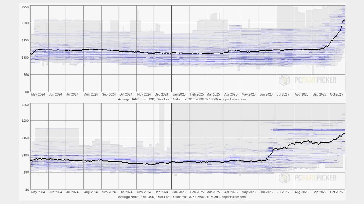 Wenn Sie in letzter Zeit nach einem RAM-Upgrade gesucht haben, ist Ihnen dieser besorgniserregende Trend vielleicht aufgefallen. Die Diagramme auf pcpartpicker.com sprechen eine deutliche Sprache: Seit Mitte 2025 steigen die Preise für DDR4- und DDR5-Speicherkits für Verbraucher, wobei seit September besonders deutliche Preisanstiege zu verzeichnen sind. Das gilt für alle Kits von DDR4-3200 bis DDR5-6000.
