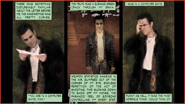 Es überrascht und erstaunt immer wieder, wenn Videospiele-Charaktere bemerken, dass sie gesteuert werden, ihre Umgebung nicht real ist und sie sich aktiv an den Spieler vor dem Bildschirm wenden. So geschieht es zum Beispiel in Max Payne (Bild). Hier bedankt sich der Held, wenn man einen dudelnden Lautsprecher in einem Fahrstuhl zerstört, unter Drogen gesetzt bemerkt und kommentiert Max außerdem die Waffenauswahl-Leiste über seinem Kopf sowie die Zeitlupenmechanik des Spiels. In Marvel vs. Capcom 3 nutzt Deadpool derweil seine Energieleiste, um sein Gegenüber zu verdreschen. Und im Retro-Konami-Hit Turtles in Time lassen sich Gegner gegen die Mattscheibe des Fernsehers werfen.