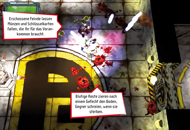 Gefängnisausbruch auf die blutige Art: Als einer von sechs Charakteren (unter anderem Psycho-Clown oder Riesenbaby) ballert Ihr Euch raus aus dem Knast und nehmt noch einen Umweg, um dem Direktor seine Schikanen mit Blei heimzuzahlen. In typischer Draufsicht schießt Ihr Euch allein oder im Koop-Modus zu zweit durch Zellentrakt, Schrottplatz, Friedhof sowie Kontrollzentrum und sammelt Schlüsselkarten von toten Feinden, um den nächsten Bereich zu öffnen. Mit Flammenwerfer, Schrotflinte, Plasmageschütz und Raketenwerfer nehmt Ihr es mit Wärtern, anderen Gefangenen und gefesselten Irren auf, die Euch mit Kopfnüssen ins Jenseits schicken wollen.