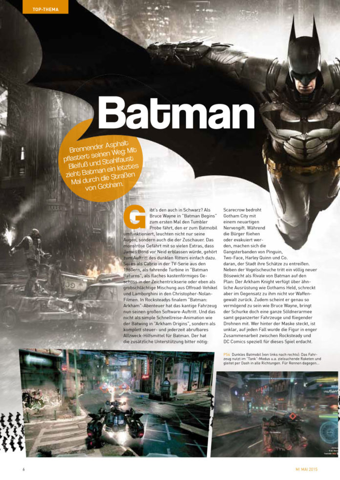 Der Dunkle Ritter hat in den letzten Jahren nicht nur in den Kinos eine hochqualitative Serie hingelegt, auch im Videospiel-Universum ist die Fledermaus mittlerweile ein Synonym für Spielspaß. Rocksteady, das englische Entwicklerstudio, das Batman Konstanz und Klasse eingehaucht hat, verabschiedet sich mit dem Next-Gen-Abenteuer Batman: Arkham Knight nun vom Superhelden – und will es noch einmal so richtig krachen lassen. Das schreit förmlich nach einer M!-Titelstory! Daher haben wir exklusiv mit Dax Ginn, dem Produzenten des Spiels, gesprochen und alle relevanten Infos zu Arkham Knight auf 6 Seiten gebündelt. Als Goodie gibt es weitere 2 Seiten Batman-Games-Retrospektive – vom ersten Auftritt bis heute.