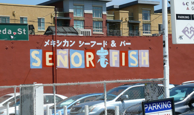 Auf dem Weg von Little Tokyo zur Metro-Station ein Blickfang an der Hauswand: Der charismatische Senor Fish wirbt für ein Restaurant. Wir meinen, der schuppige Bruder würde sich auch als spielbarer Charakter in einem Videospiel gut machen…