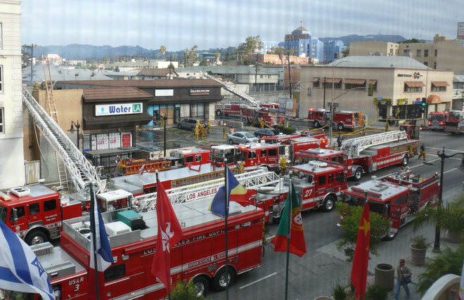 Überraschung am zweiten Morgen in LA: Gegenüber vom Hotel steht ein Gebäude kurzzeitig in Flammen – nach der Ankunft von gefühlten 25 Löschzügen löst sich das Problem aber buchstäblich in Rauch auf
