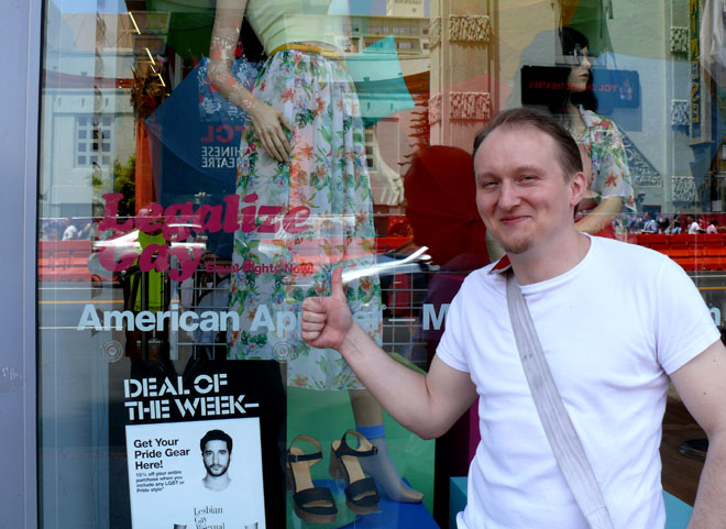 Ein Schaufenster-Aufkleber am Walk of Fame fordert die Gleichstellung von Homosexuellen. Das findet auch Michael gut.