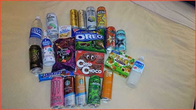 Matthias im Energy-Drink-Rausch. Jeder Besuch in den Vereinigten Staaten fördert neue Koffein-, Taurin- und Guarana-Brausen zu Tage – diesmal gab es reichlich Rockstars. Außerdem waren wir in einem japanischen Supermarkt, um Inari-Sushi (nicht im Bild, schon verputzt), das süchtig machtende Calpico-Getränk und komische Süßigkeiten zu kaufen – auch schon ein kleines Ritual an unserem freien Samstag vor der E3-Sause.