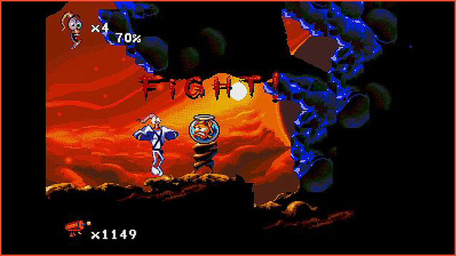Das soll ein Endgegner sein? Der selbst ernannte Killergoldfisch Bob schwimmt durch sein Mini-Aquarium, schaut grimmig und lässt seine Handlanger die Drecksarbeit erledigen. Kein Wunder, dass der Kampf gegen das immobile Haustierchen nicht schwer ist: Wurmheld Jim schnappt sich seinen schuppigen Widersacher und schluckt ihn einfach herunter.