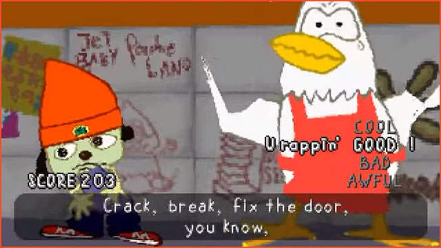 Ein Welpe mit Strickmütze rappt seine Probleme weg – sei es die Fahrprüfung, ein Flohmarktverkauf oder die Warteschlange vor der öffentlichen Toilette. Parappa und seine beiden Nachfolger bieten eingängige Musik und einen einzigartigen Grafikstil.
