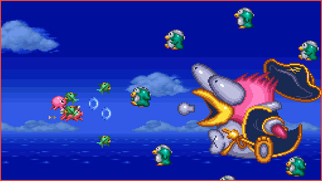 Mit Parodius machte sich Konami über den eigenen Action-Erfolg Gradius lustig. Aus Aliens und Kampf-Mechas werden Pinguine und Spritzen, Vulkane speien Auberginen und die Gradius-typischen Moai-Köpfe rauchen und tragen Sonnenbrillen.