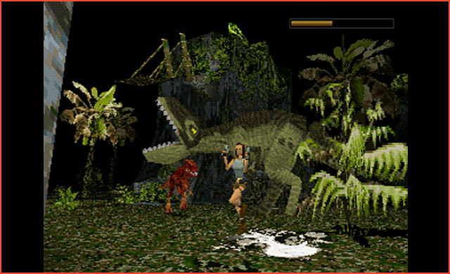 Damit rechnet anno 1996 kein Spieler: In einer Höhle öffnet sich ein von Palmen, Farnen, Gras und Skeletten gesäumter Bereich. Aus dem Dunkel des Hintergrunds tauchen plötzlich urzeitliche Velociraptoren auf, und schließlich stapft sogar ein Tyrannosaurus ins Bild.