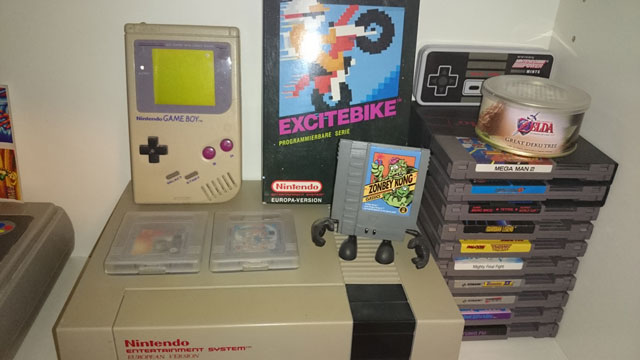 Oben seht Ihr die kümmerlichen Reste meiner Game Boy Sammlung (Hardware + Super Mario Land 2 + F1 Race). Das Gerät funktioniert auch nach über 20 Jahren einwandfrei, nur die Bildschirmscheibe hat sich gelöst und musste geklebt werden. Das Battery Pack und der 4-Spieler-Adapter von F1 Race liegen in meiner Kabelkiste, alles andere wurde auf zig Trödelmärkten verkauft, um Geld für SNES und PSone zusammenzuraffen.