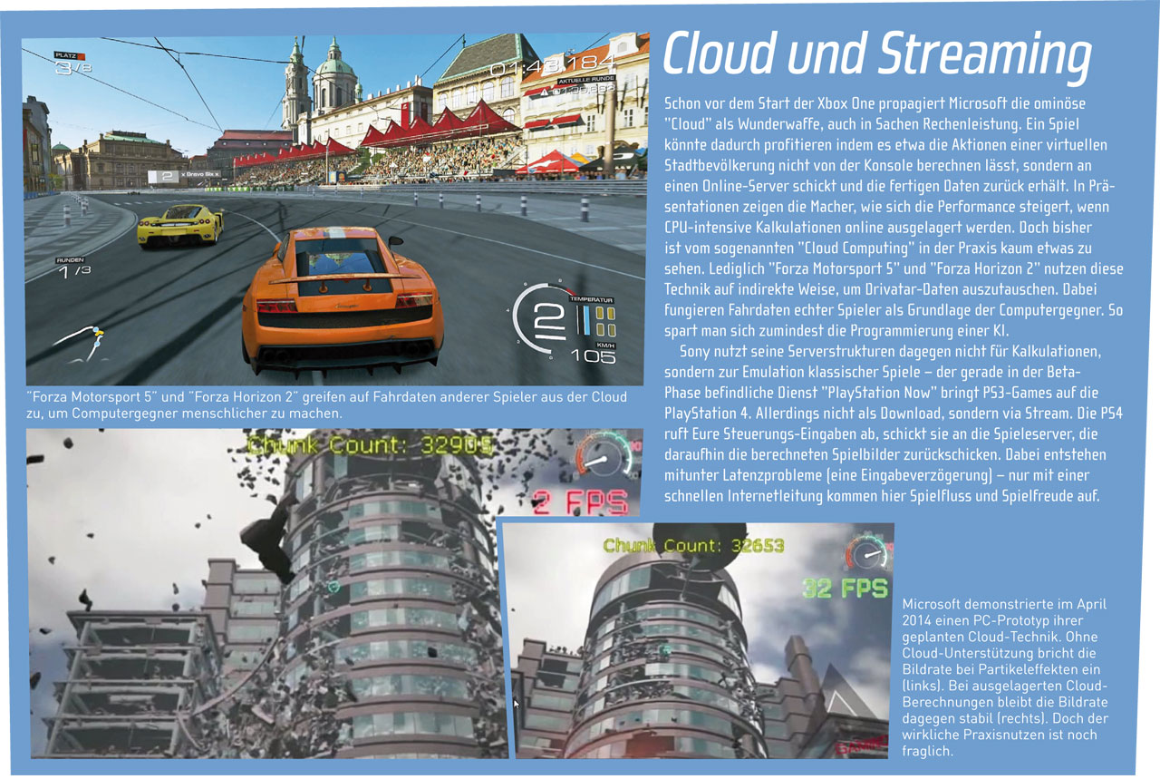 Die eingesetzten Shader-Einheiten berechnen einen Großteil der 3D-Grafik, kümmern sich um die Texturdarstellung und sind maßgeblich für die Grafikpower verantwortlich. Zudem entlasten sie die CPU, die währenddessen andere Aufgaben übernehmen kann, zum Beispiel die KI-Berechnungen. Ergebnis: In der Theorie ist die PS4 der Xbox One dank einer grafischen Leistung von 1,84 TFlops um 50% überlegen. Doch hier ist das letzte Wort noch nicht gesprochen, denn die Xbox One hat einen Trumpf im Ärmel.
