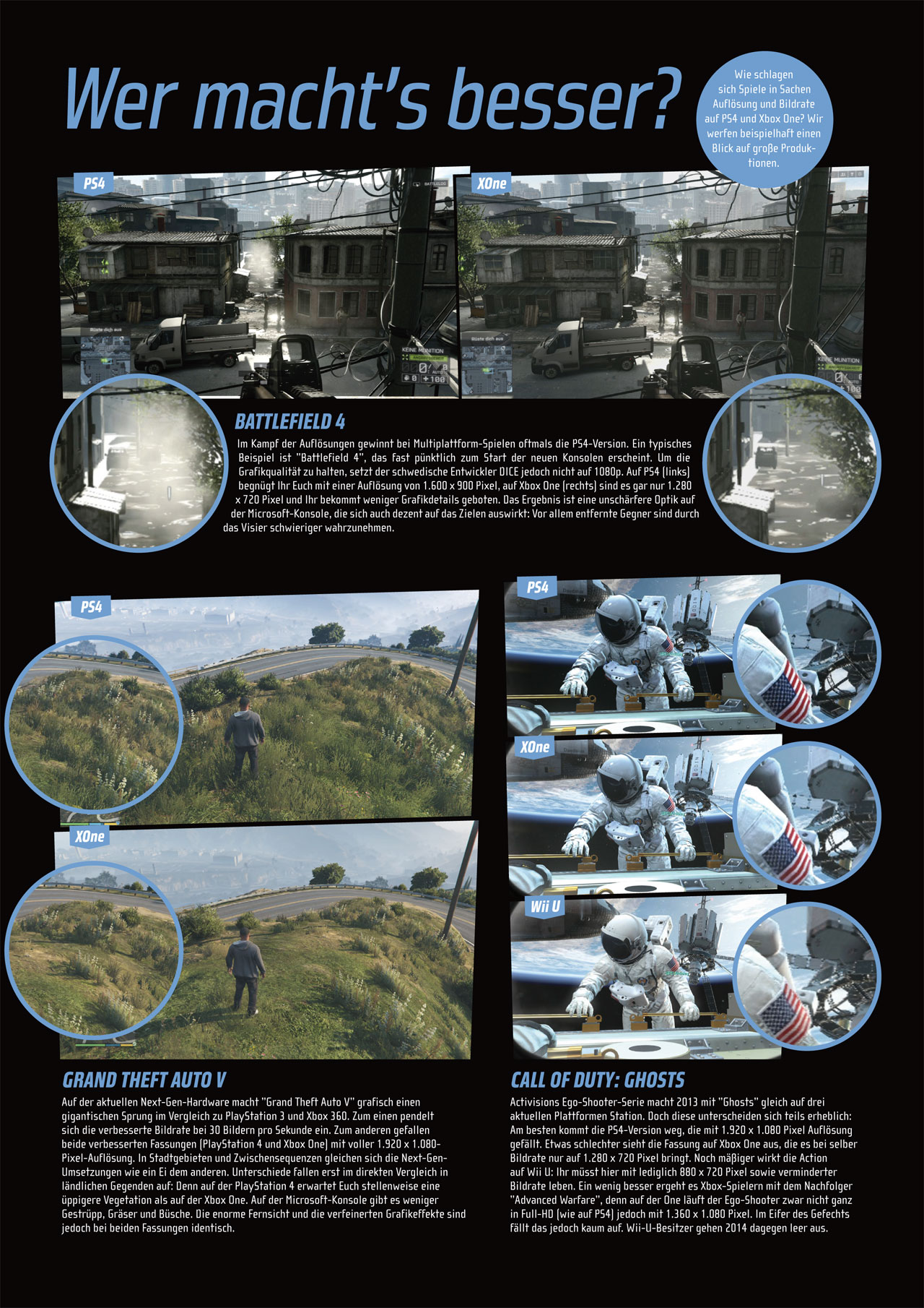 Entwickler können frei bestimmen, was sie im eSRAM der Xbox One ablegen, seien es dynamische Texturen oder Schattenmodelle. Die Daten sind dank hoher Bandbreite von 109 GB pro Sekunde sofort verfügbar und müssen nicht über den langsamen DDR3-Arbeitsspeicher geladen werden. Leider gibt es dabei ein Problem, denn das eSRAM ist für eine volle Auflösung von 1080p samt Effekten wie etwa Anti-Aliasing zu knapp bemessen. Deshalb weichen viele Spiele auf der Xbox One auf eine niedrigere Auflösung aus. Meist auf 900p, in manchen Fällen auch auf 792p wie bei Titanfall. Dazu Richard Baker, Lead Engineer bei Respawn Entertainment: Es gibt immer Kompromisse zwischen höherer Auflösung, besseren Pixelshadern und komplexerer Grafik. Die Xbox-Hardware ist flexibel, das eSRAM kann jederzeit für Texturen oder Renderaufgaben genutzt werden, selbst wenn die Daten nur teilweise eingeladen sind. Mehr eSRAM würde eine bessere Leistung, aber auch Mehrkosten für die Konsole bedeuten. Jean-Baptiste Bolcato, Produzent bei Rebellion (Sniper Elite 3), stößt ins gleiche Horn: Das eSRAM ist einfach zu benutzen. Aber es ist ein bisschen zu klein, um damit eine Auflösung von 1080p auszugeben. Deshalb muss man tricksen, zum Beispiel das Bild mehrfach unterteilen, um es auszugeben.