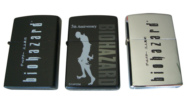 Original und Fälschung: in der Mitte ein Original-Biohazard-5th-Anniversary-Zippo, links und rechts billige Hong-Kong-Kopien.