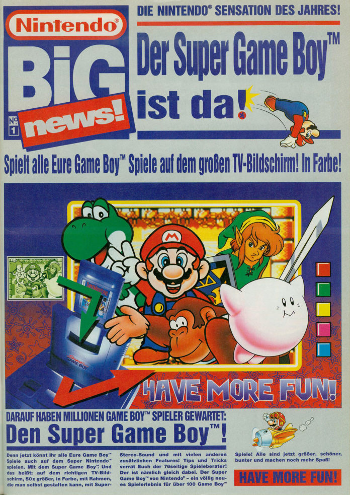 Ich hab meinen Super Game Boy auch noch in Gebrauch.Die Reklame oben gabs auch als Flyer im Zeitungsformat. Hab ich glaub ich auch noch irgendwo rumliegen. 🙂