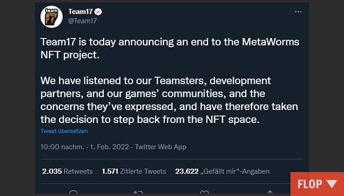 Toll gemacht. Erst kündigt Team 17 Worms NFTs an. Dann wird schnell klar, dass der Quatsch wieder von irgendwelchen überbezahlten Anzugaffen ausgeknobelt wurde und die Leute, die die tatsächliche Arbeit machen entweder strickt dagegen waren oder nicht einmal etwas davon wussten. Der Zorn der Fans bricht über Team 17 herein, diverse Partnerstudios distanzieren sich sofort und nach kurzer Zeit rudert auch Team 17 wieder zurück. Hoffentlich müssen die Idioten, die das zu verantworten haben den Hut nehmen. Vermutlich aber nicht. Und hoffentlich haben andere Manager, die vermutlich schon vor lauter NFT-Blödsinn einen Gier-Ständer in der Hose haben, gut aufgepasst. Gebt NFTs keine Chance und lasst es alle Firmen wissen, die auch nur laut darüber nachdenken, in dieses klimafeindliche Pyramidensystem einzusteigen.