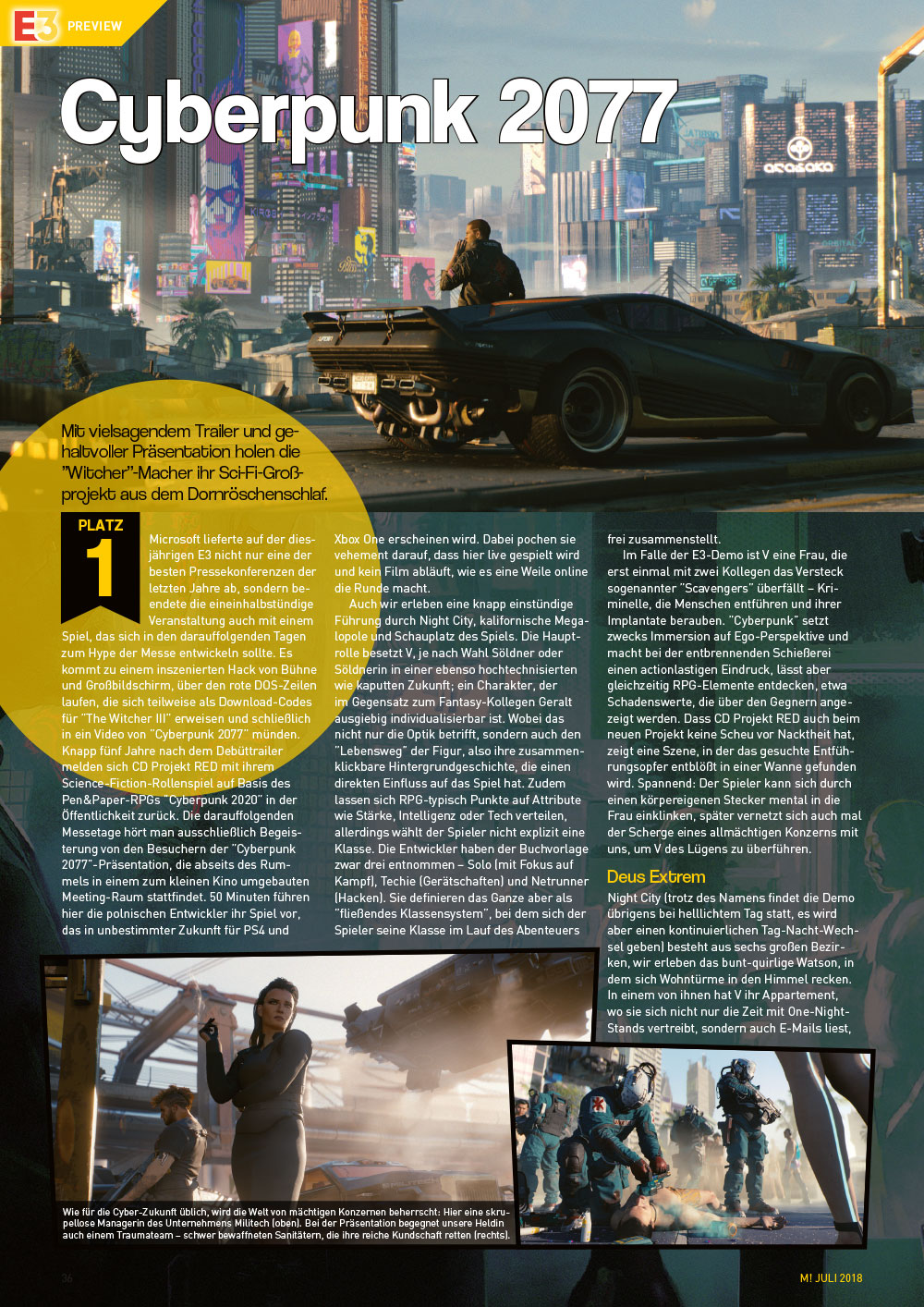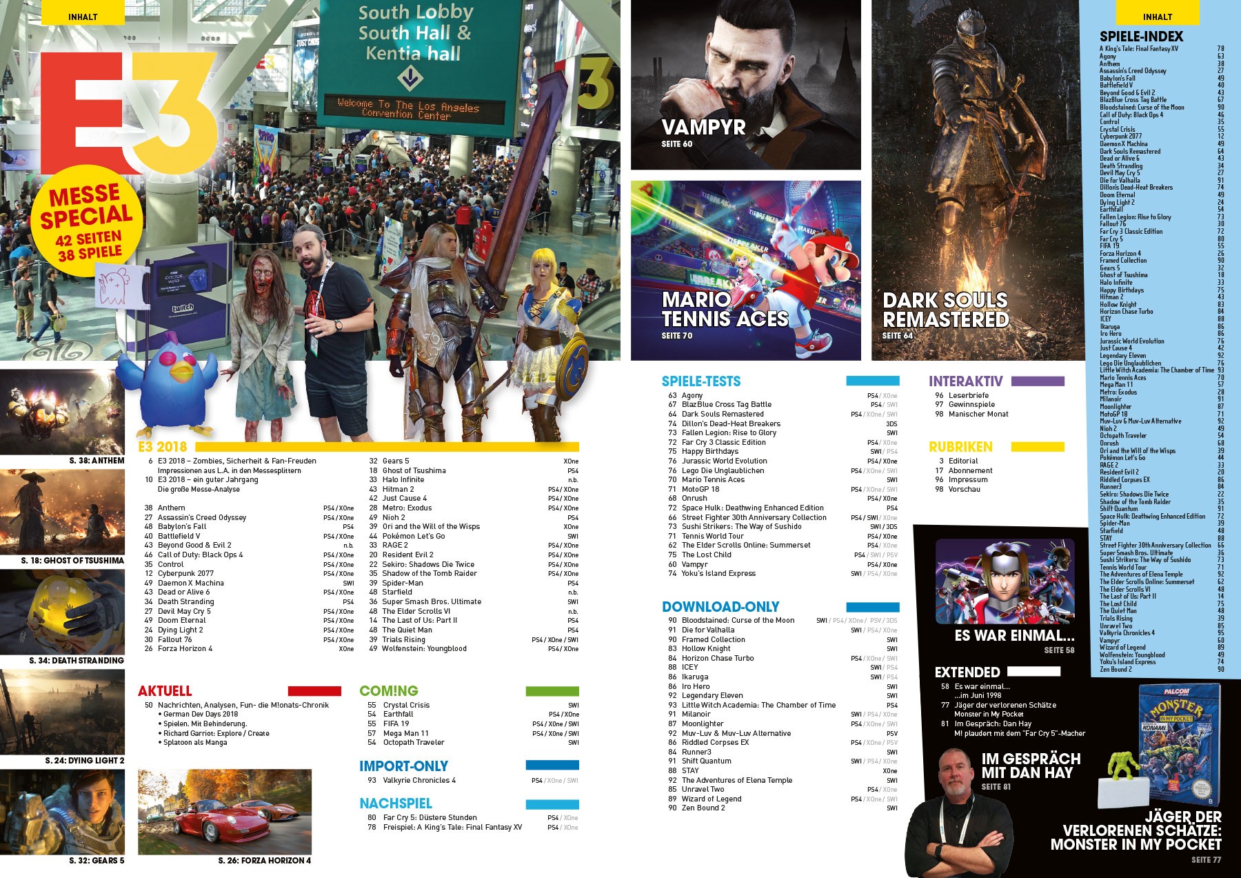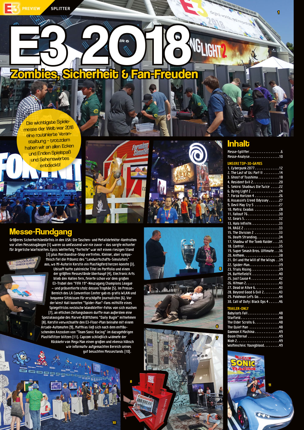 Entsprechend gibt es auf 42 Seiten ein buntes Potpourri aus Messe-Impressionen, Analysen sowie Meinung und natürlich Vorschau-Artikel en masse. Wir haben für Euch die unserer Ansicht nach 30 besten Spiele der E3 herausgepickt und liefern spannende Einblicke und Hands-on-Eindrücke, unter anderem zu Cyberpunk 2077, The Last of Us: Part II, Resident Evil 2, Sekiro: Shadows Die Twice, Fallout 76 und Super Smash Bros. Ultimate.