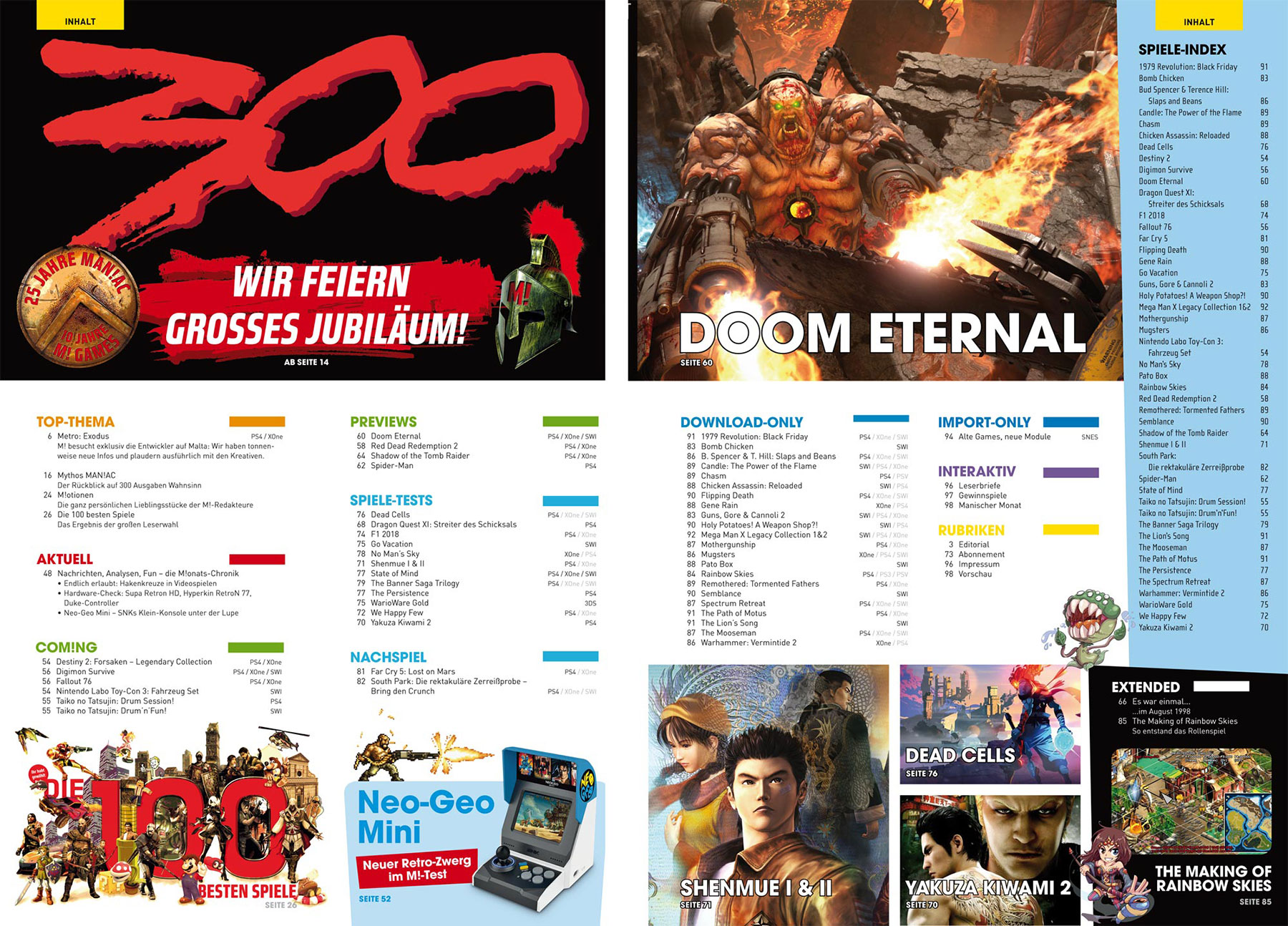 Natürlich gehören auch die üblichen schönen Dinge der Videospielwelt in eine Jubiläumsausgabe – spannende Previews zum Beispiel: Wir haben ausgiebig Rise of the Tomb Raider gespielt, berichten über Spider-Man und haben die neuesten Infos und Bilder zu Red Dead Redemption 2 am Start. Außerdem ganz heiß: Doom Eternal frisch von der QuakeCon.