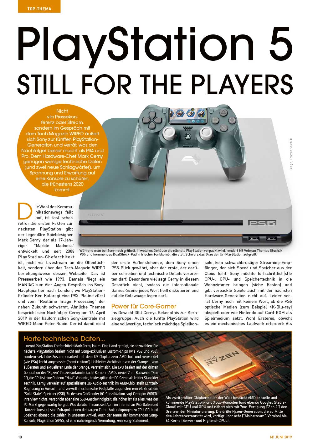 Wichtiger als jede Spiele-Premiere war jedoch Sonys Vorpreschen in Sachen neuer Konsole: US-Hardware-Architekt Mark Cerny verriet in einem Interview die ersten Details zur kommenden PlayStation – und die haben es in sich. Topaktuelle CPU und GPU, Raytracing, SSD, Spiele weiterhin auf Datenträgern – die PS5 bekennt sich zur Kerzielgruppe der Core-Gamer, noch bevor Microsoft auf der E3 die neue Xbox vorstellt. M!-Veteran Winnie Forster macht für Euch den Technik-Check!