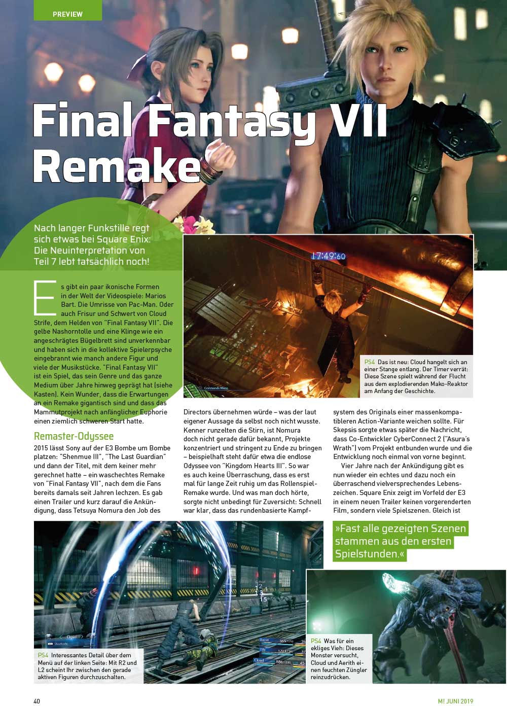 Eingangs sprachen wir von Überraschungen – davon hatte auch Square Enix eine im Gepäck. Denn es war sehr lange still um das lang ersehnte Final Fantasy VII Remake: Doch nun gab es ein kräftiges Lebenszeichen und sogar erste Spielszenen zu sehen; Rollenspiel-Experte Thomas Nickel hat für Euch ganz genau hingeschaut. Darüber hinaus tummeln sich im Preview-Bereich unter anderem das noch nicht ganz ausgereifte Möchtegern-Dark Souls namens Code Vein, Media Molecules Spiel-Baukasten Dreams und Vampire: The Masquerade – Bloodlines 2. Zudem haben wir noch brandaktuelle Hands-on-Eindrücke zum Loot-Shooter schlechthin, Borderlands 3.
