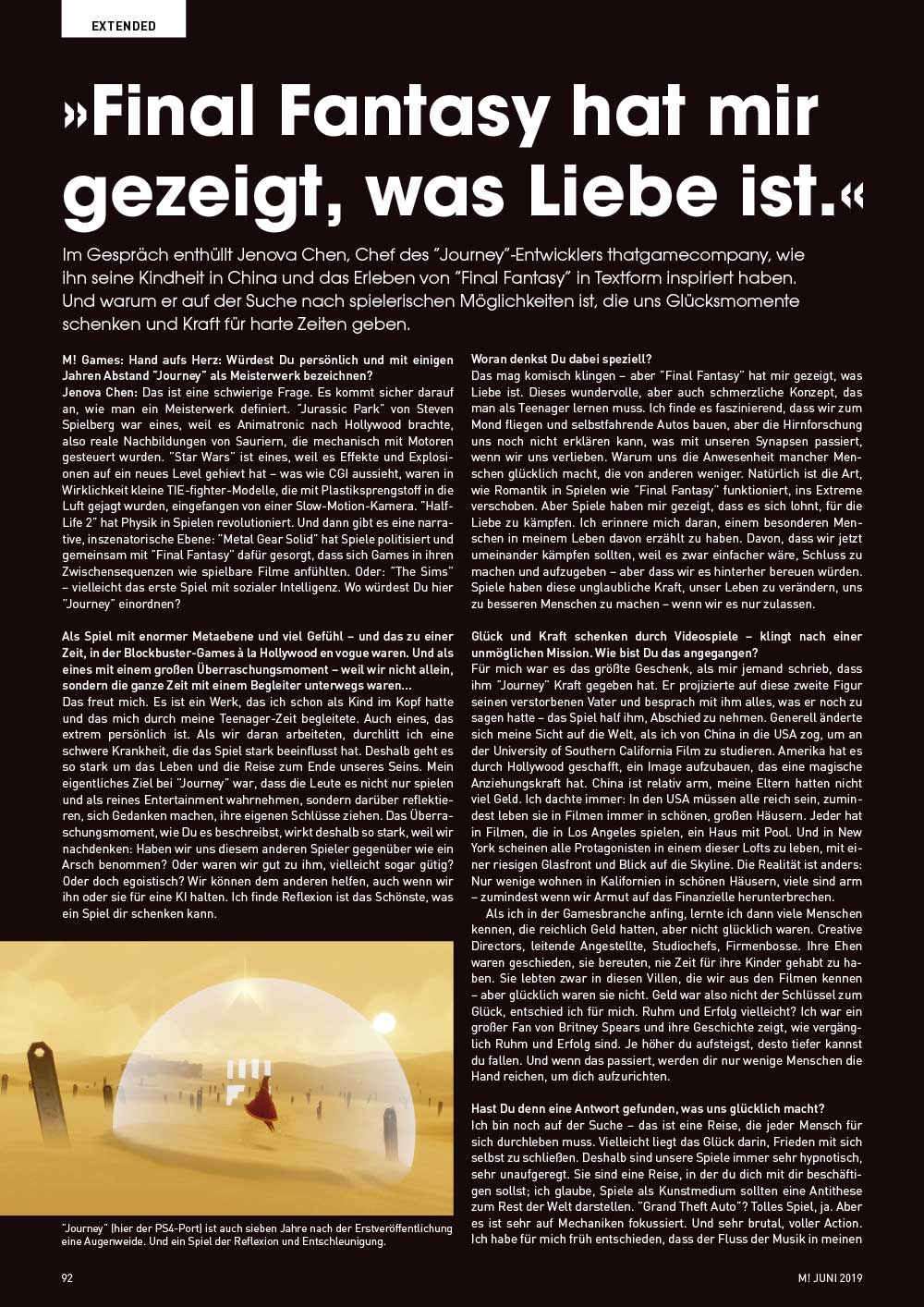 In der Extended-Sektion spannen wir den Bogen von der Retro-Zeit zur Moderne. Zum einen feiern wir 30 Jahre Game Boy mit einem Pixel-Kunstwerk und die Super Smash Bros.-Reihe in einer Retrospektive. Zum anderen sprechen wir mit dem Journey-Schöpfer Jenova Chen über sein bisheriges Werk und seine Zukunft und besuchen eine abgefahrene Arcade in Fernost. Schließlich jagen wir nach wertvollen Retro-Schätzen und finden die beiden RPG-Perlen Lunar: The Silver Star & Lunar Eternal Blue.