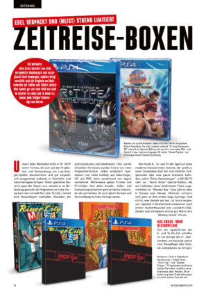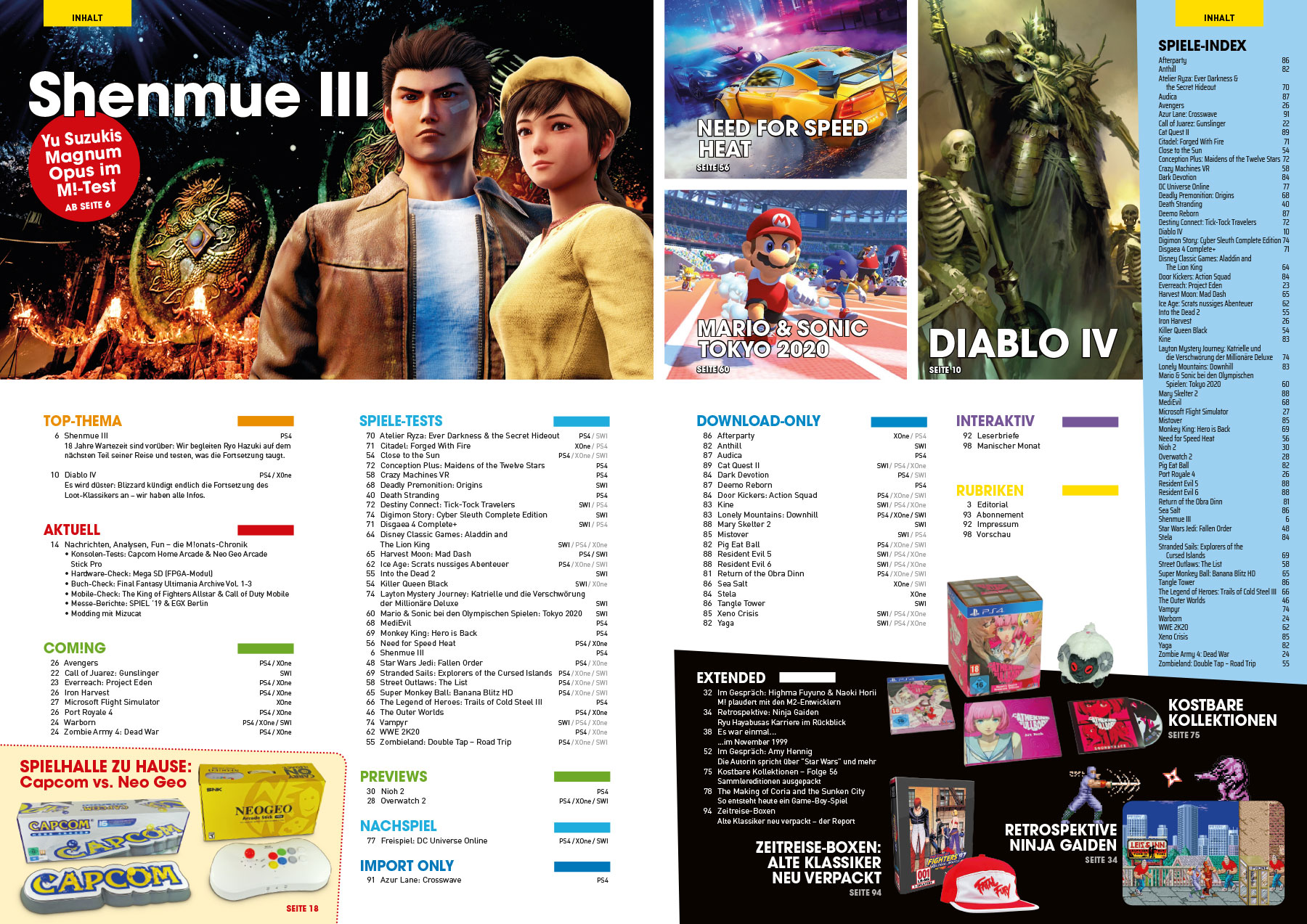 Im Aktuell-Teil vergleichen wir die beiden Spielhallen-Konsolen Capcom Home Arcade und Neo Geo Arcade Stick Pro und in der Extended-Abteilung plaudern wir mit Ex-Naughty-Dog-Chefautorin Amy Hennig sowie den M2-Entwicklern Highma Fuyuno und Naokii Hori. Dazu gibt es eine Retrospektive zu Ninja Gaiden, die neuesten Collector’s Editions und ein Making-of zu Coria and the Sunken City, einem Game-Boy-Spiel, bei dem M!-Autor Thomas Nickel involviert ist. Zu guter Letzt widmet sich Winnie Forster den Zeitreise-Boxen und gibt einen Überblick über neu verpackte alte Klassiker.