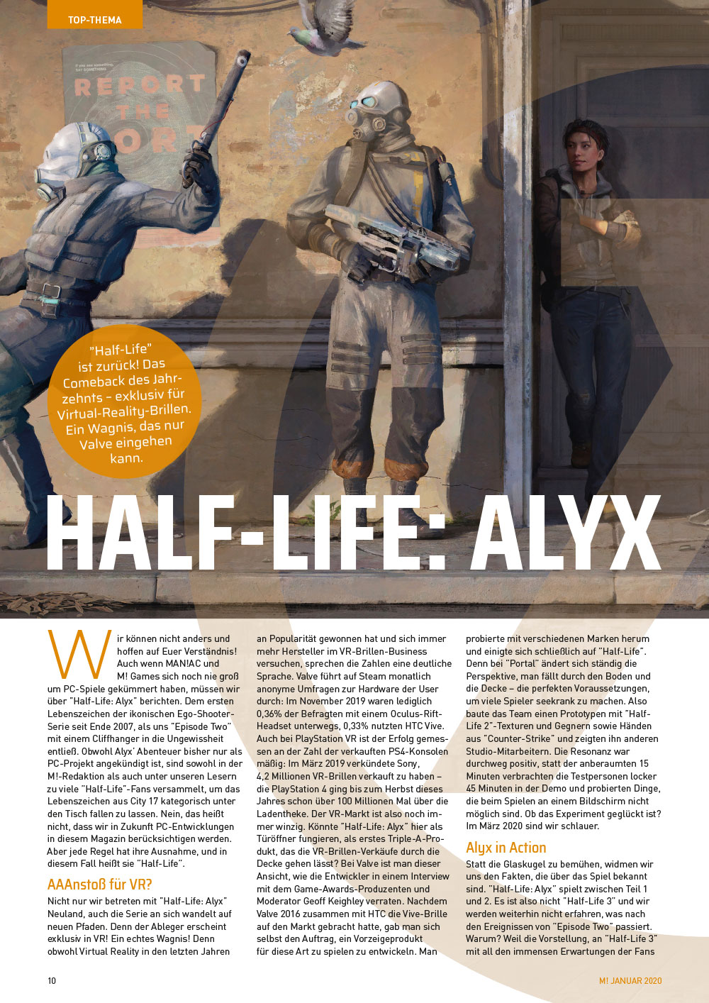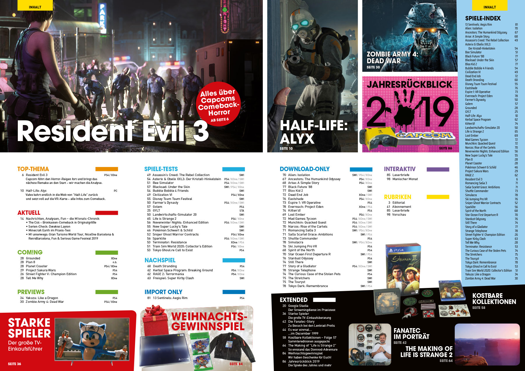 Kommen wir doch mal zu den Spielen: In den letzten Wochen gab es zwei spektakuläre Neuankündigungen – und die teilen sich unser Kiosk-Cover. Zum einen überraschte Capcom mit dem Remake von Resident Evil 3, das nicht nur so gut aussieht wie das exzellente Resident Evil 2 aus diesem Jahr, sondern auch das Online-Katz-und-Maus-Spiel Project Resistance als Multiplayer-Modus enthält. Zum anderen kam Entwickler Valve endlich mal aus dem Quark und präsentierte mit Half-Life: Alyx endlich ein Lebenszeichen der Kult-Serie. Ja, das Spiel ist aktuell nur für PC und nur für kompatible VR-Systeme angekündigt. Warum wir dennoch darauf hoffen, den Ego-Shooter auch auf Konsole daddeln zu können, erläutern wir im ausführlichen Preview.
