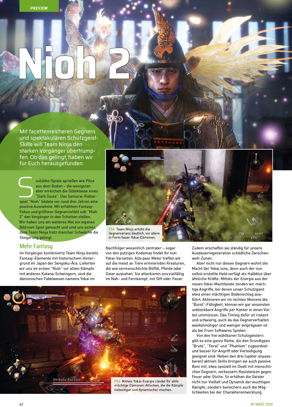 In der Preview-Sektion geht es fantastisch zu: Kurz vor dem Release haben wir noch einmal mehrere Stunden in das Fernost-Action-RPG Nioh 2 geschnuppert. Ja, wir sind häufig gestorben, haben aber auch sehr viele Neuerungen entdeckt, die das Soulslike noch besser machen könnten als den eh schon sehr guten Vorgänger – wir sind gespannt! Ebenfalls verbessert wurde Persona 5: Das erscheint Ende März als erweiterte Royal-Version und wird erneut in höchste Wertungssphären aufsteigen – mit dieser Prognose lehnen wir uns nicht allzu weit aus dem Fenster.