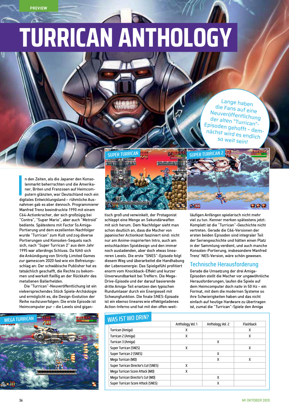 Im Preview-Bereich widmen wir uns der digitalen gamescom 2020, die zwar keine großen Überraschungen bereithielt, mit Turrican Anthology aber immerhin Gamer-Veteranen in Verzückung versetzte. Zusätzlich haben wir alle Infos über Gotham Knights und Suicide Squad: Kill the Justice League parat und durften Ubisofts Immortals: Fenyx Rising anspielen. Wer sich auch für das Drumherum in der Games-Branche interessiert, erfährt im Aktuell-Teil alles über den Riesen-Konzern Embracer Group und seine zahlreichen Verflechtungen, bekommt einen Überblick über das 35-jährige Jubiläum von Super Mario Bros. und einen Lesetipp mit dem Handbuch Gameskultur.