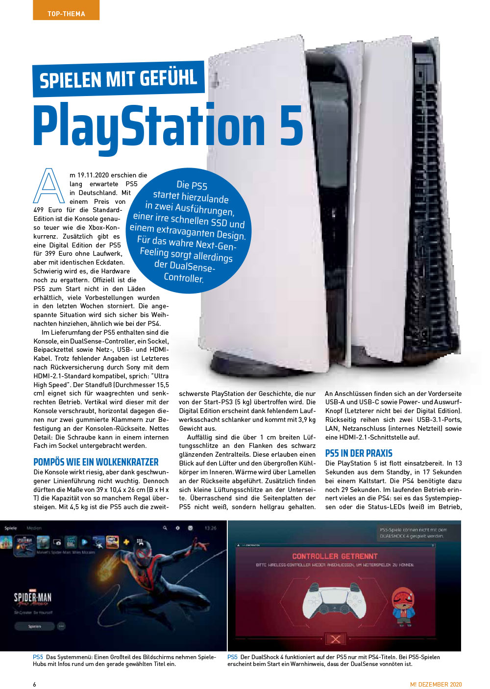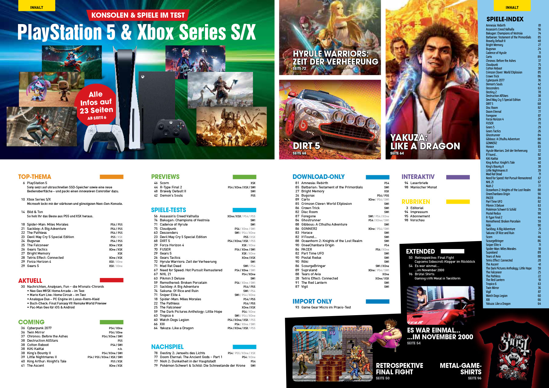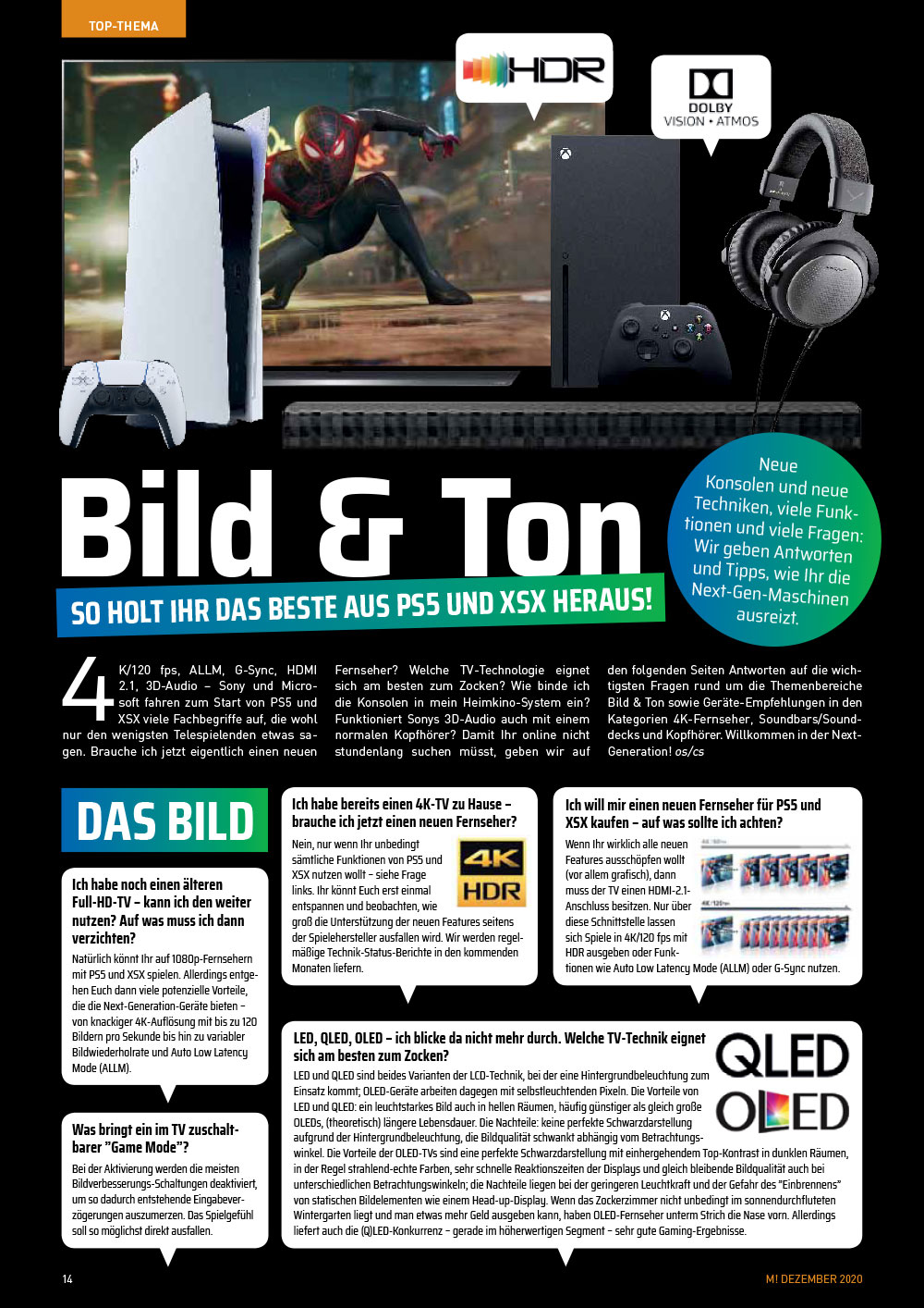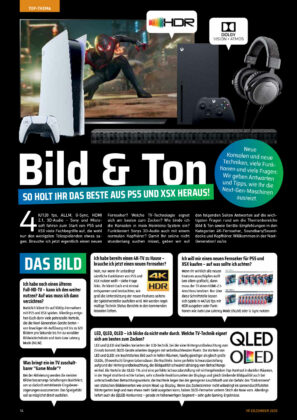 Der Start einer neuen Konsolengeneration ist auch für uns alte Hasen noch immer etwas Besonderes – und das muss natürlich gebührend gefeiert werden! Trotz einiger Widrigkeiten und diverser verspäteter Testmuster (Day-One-Patch, wir hassen dich!) präsentieren wir Euch auf dicken 23 Seiten alles Wissenswerte über PlayStation 5 und Xbox Series S/X. Angefangen von den Geräten über Spieletests (u.a. Spider-Man: Miles Morales, Sackboy: A Big Adventure, The Pathless, Gears Tactics, Tetris Effect: Connected und The Falconeer) bis hin zu einem Q&A-Ratgeber, wo wir Praxistipps geben, wie Ihr in Sachen Bild & Ton das Maximum aus den neuen Daddelmaschinen herausholt. Und wem das nicht reicht: In den kommenden Ausgaben werden wir natürlich weiter über die neuen Konsolen berichten und intensiver miteinander vergleichen – wer wird wohl der Sieger im Rennen zwischen PS5 und XSX sein?