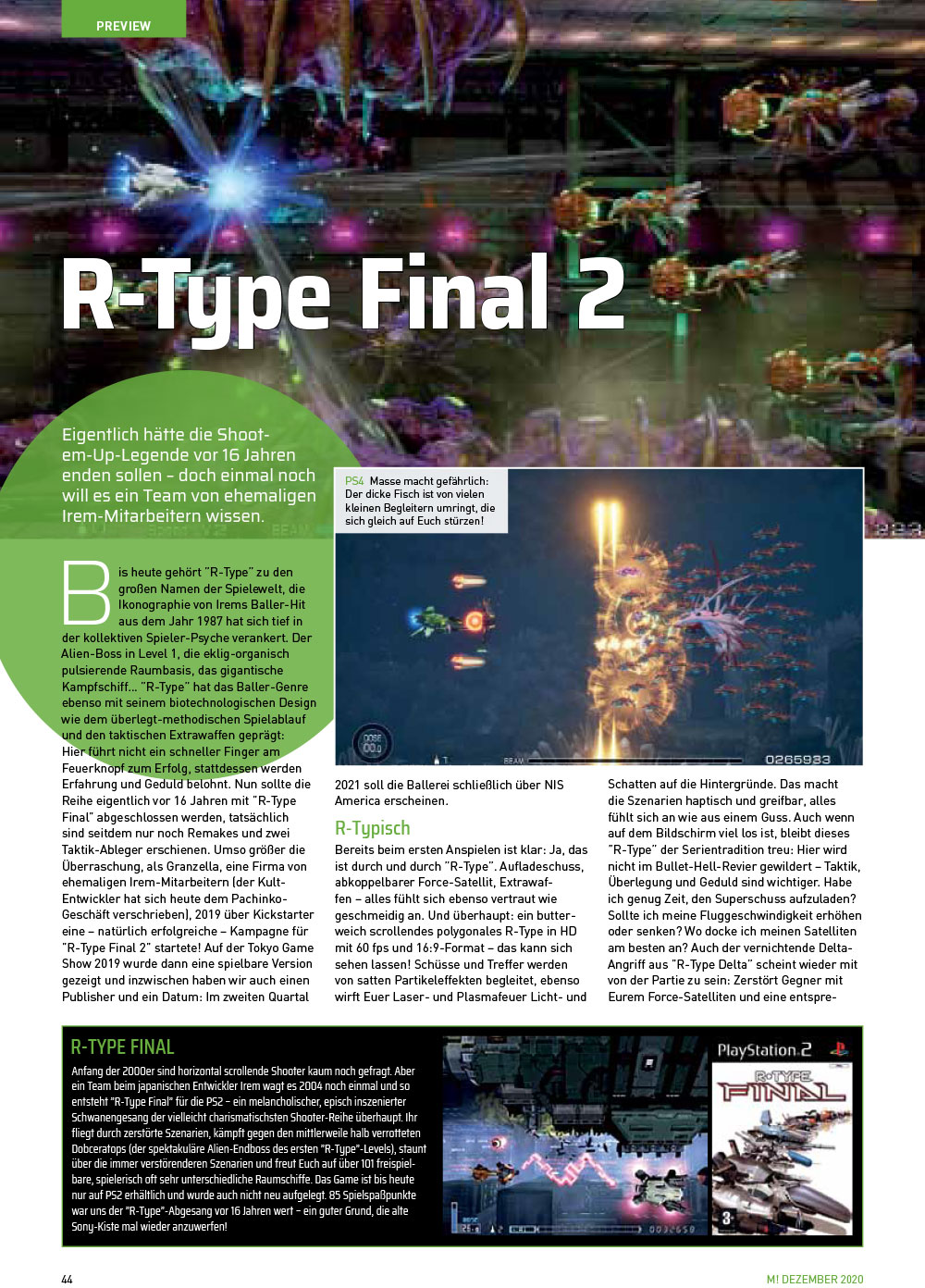 Wer dagegen noch mit seiner aktuellen Generation zufrieden ist oder kein Vorbesteller-Glück hatte, muss sich nicht grämen – im Gegenteil! Im Preview-Teil zum Beispiel tauchen wir ein in die wunderbare Oldschool-Welt der Shoot’em-Ups, denn mit R-Type Final 2 kommt in wenigen Monaten eine sehnsüchtig erwartete Fortsetzung für alle Systeme. Das Ballerspiel startet mit HD-Grafik und einer Anpassung auf das 16:9-Format endlich in die Moderne und bietet auch spielmechanisch diverse spannende Aspekte – freut Euch drauf!