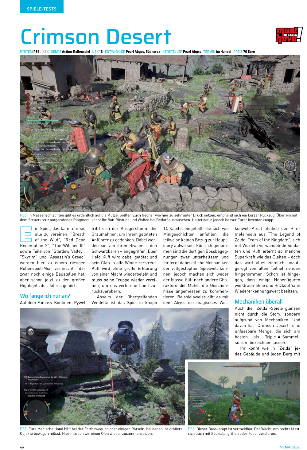 Im Test-Teil beeindruckt Crimson Desert mit einer gigantischen Open World und locker über 100 Stunden Spielspaß. Dass dabei munter Elemente aus etwa The Witcher III, The Legend of Zelda: Breath of the Wild, Red Dead Redemption 2 oder auch Stardew Valley und Assassin’s Creed vermischt werden, macht das Ganze noch interessanter. Nicht minder empfehlenswert sind Highlights wie Tomodachi Life: Wo Träume wahr werden und Super Mario Bros. Wonder + Gemeinsam im Bellabel-Park sowie Minishoot’ Adventures und Bonnie Bear Saves Frogtime aus der Download-only-Sektion.