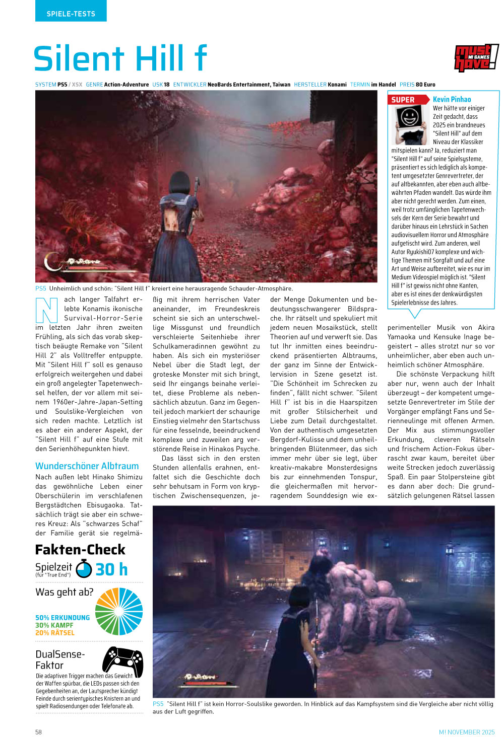 Im Test-Teil tummeln sich ebenfalls nur so die Hits: Ob Ego-Shooter (Battlefield 6, Borderlands 4), Action (Hades II, Absolum, Ninja Gaiden 4, Earthion), Taktik-Schwergewicht (Final Fantasy Tactics – The Ivalice Chronicles, Frostpunk 2), Horror-Abenteuer (Silent Hill f), Jump’n’Run-Geniestreich (Super Mario Galaxy 1 + 2), Fun Racer (Sonic Racing: CrossWorlds) oder Sport (EA Sports FC 26, NBA 2K26) – hier gibt es für jeden Geschmack passendes Konsolenfutter.