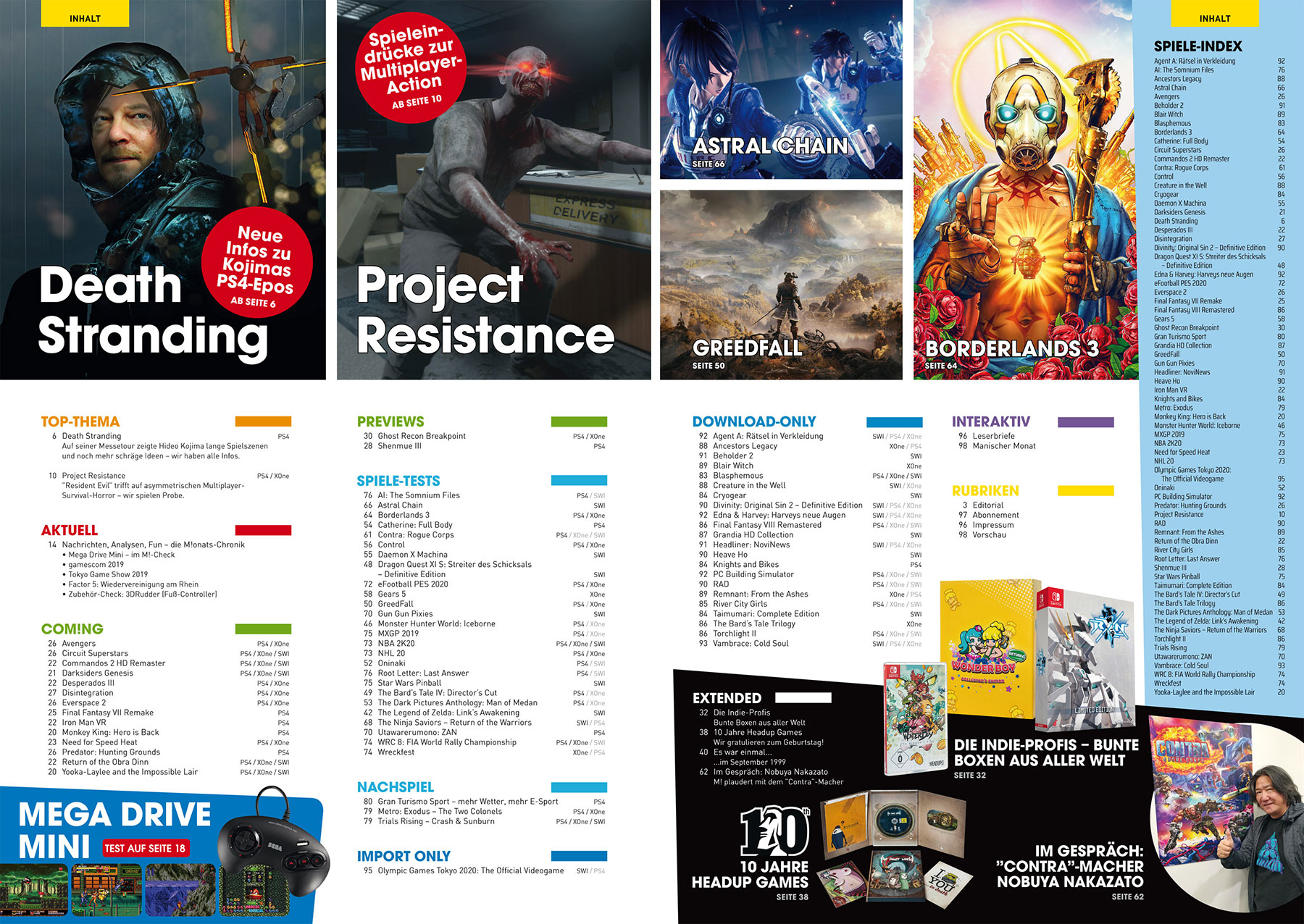 Was gibt es noch zu entdecken? Unseren Test der großartigen Kleinkonsole Mega Drive Mini, eine gigantische Indie-Games-aus-aller-Welt-als-Special-Editions-Reportage, eine Interview mit dem Contra-Macher Nakazato und (schlechten) Sega-Sport aus Japan.