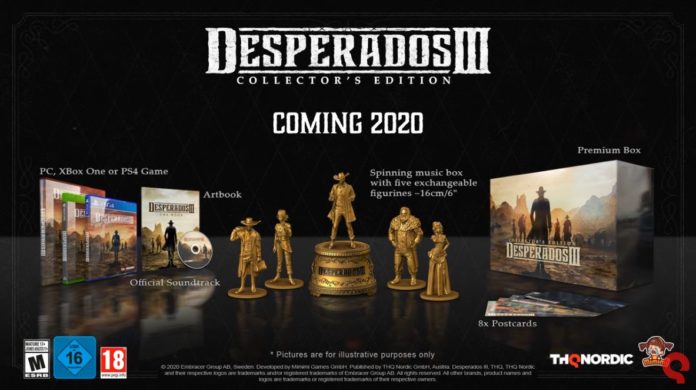 THQ Nordic kündigt an, dass zu Desperados III auch eine Collector’s Edition erscheinen wird. Sie ist im Sommer zum Preis von 119,90 Euro verfügbar und bietet abseits des Hauptspiels folgende Ihalte: