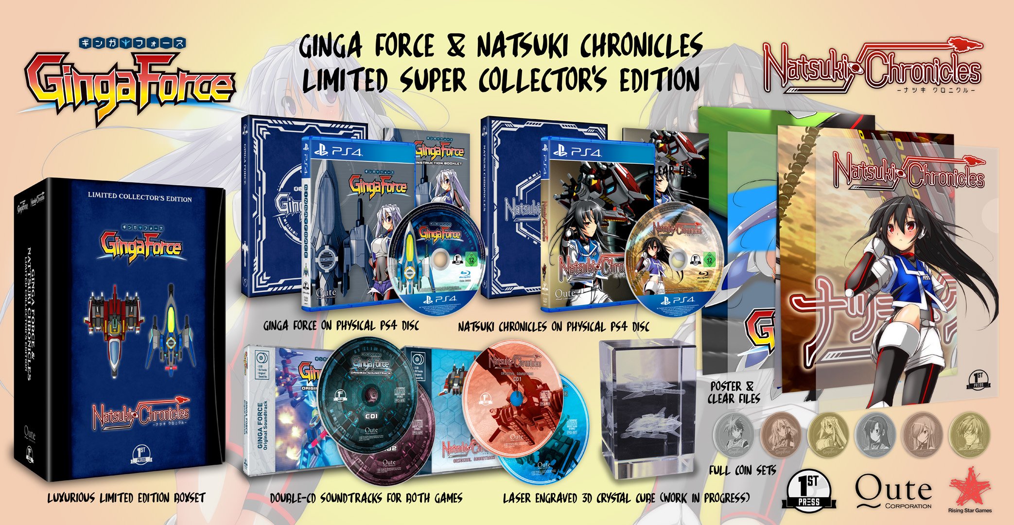 Mittlerweile ist Ginga Force auch auf PS4 erhältlich (und von uns hier gestetet), Natsuki Chronicles soll demnächst folgen. Neben einer digitalen Veröffentlichung werden die beiden dann auch separat und im Doppelpack auf Datenträger veröffentlicht: Der deutsche Anbieter First Press Games hat sich die Ballereien gesichert und bietet fünf Fassungen an.