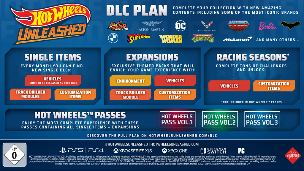 Drei Hot Wheels-Pässe schalten demnach spezielle DLC-Inhalten frei, die sowohl Hot Wheels-Originale umfassen, als auch weitere bekannte Marken, beispielsweise Barbie, DC, Masters of the Universe, Street Fighter, Teenage Mutant Ninja Turtles sowie OEMs wie Aston Martin, BMW und McLaren und viele mehr.