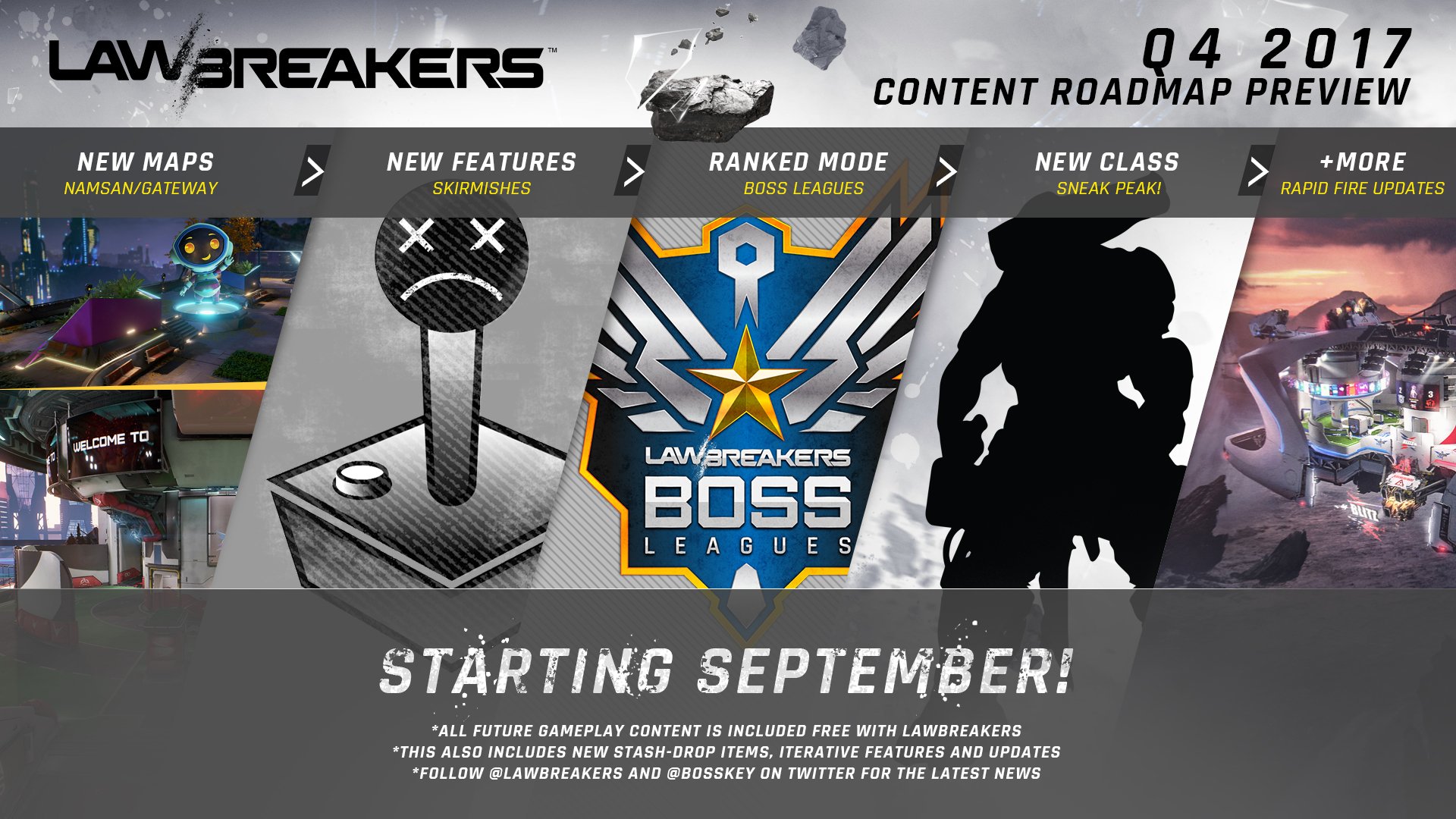 Oben gewähren uns Publisher Nexon und Entwickler Boss Key Productions einen ersten Blick auf die noch in diesem Jahr geplanten Zusatzinhalte für LawBreakers. Genauere Informationen zu den neuen Karten, Features und Klassen gibt es dann nächste Woche.
